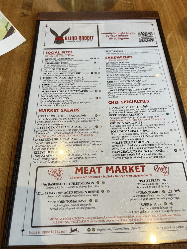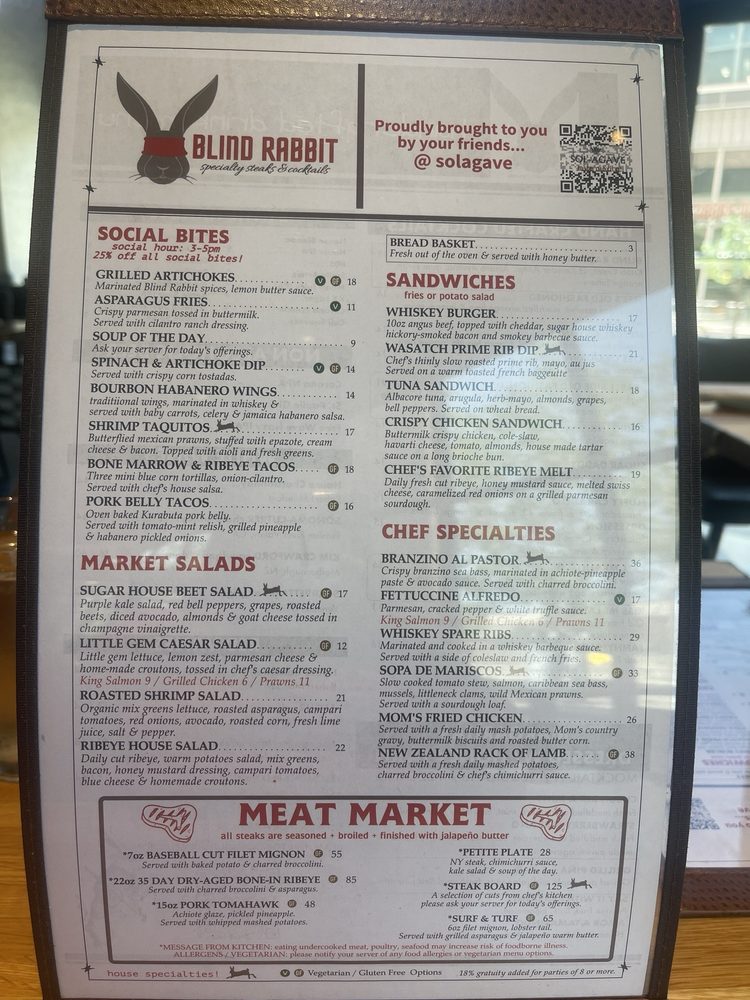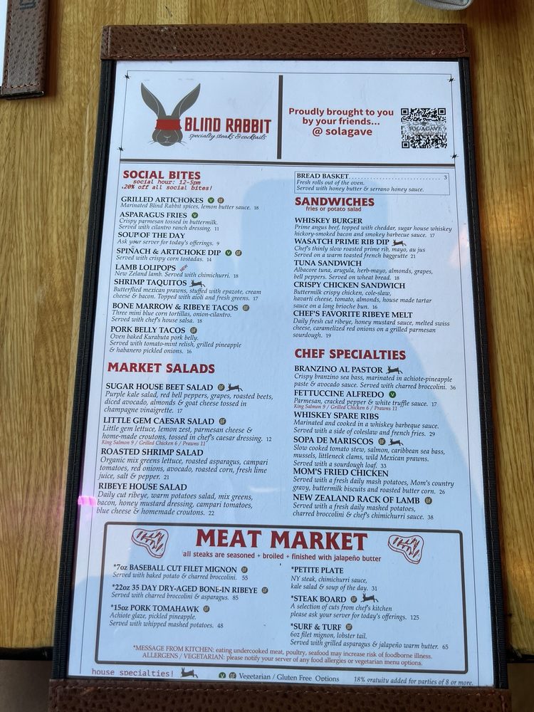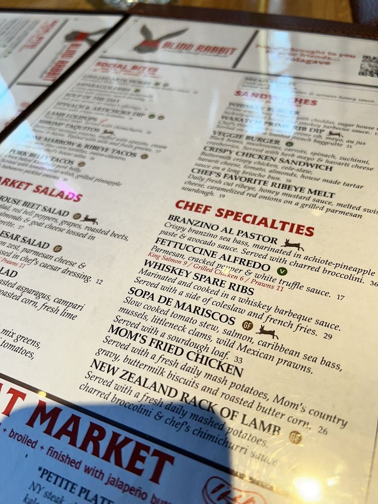 Blind Rabbit Kitchen, located in Salt Lake City, UT, is a seafood and steakhouse restaurant that offers a wide range of amenities like outdoor seating, wheelchair accessibility, and live music. Their menu features delicious appetizers such as asparagus fries, bone marrow tacos, and shrimp taquitos. Their signature sandwiches include the Chef's Favorite Ribeye Melt and the Crispy Chicken Sandwich. The Kids Menu offers options like mac & cheese, NY steak, and salmon, ensuring there's something for everyone. With a full bar, happy hour specials, and a variety of payment options including cryptocurrency, Blind Rabbit Kitchen caters to a diverse range of customers. Be sure to try their flavorful dishes and enjoy the vibrant atmosphere at this unique dining establishment.